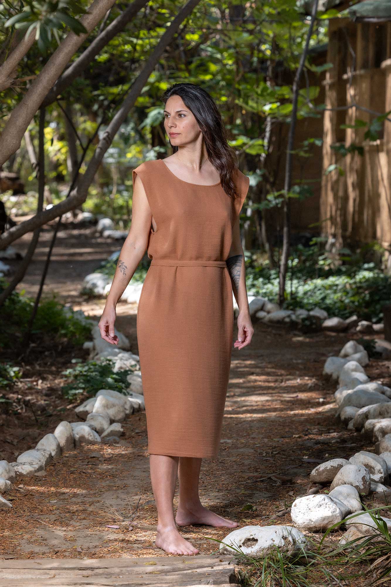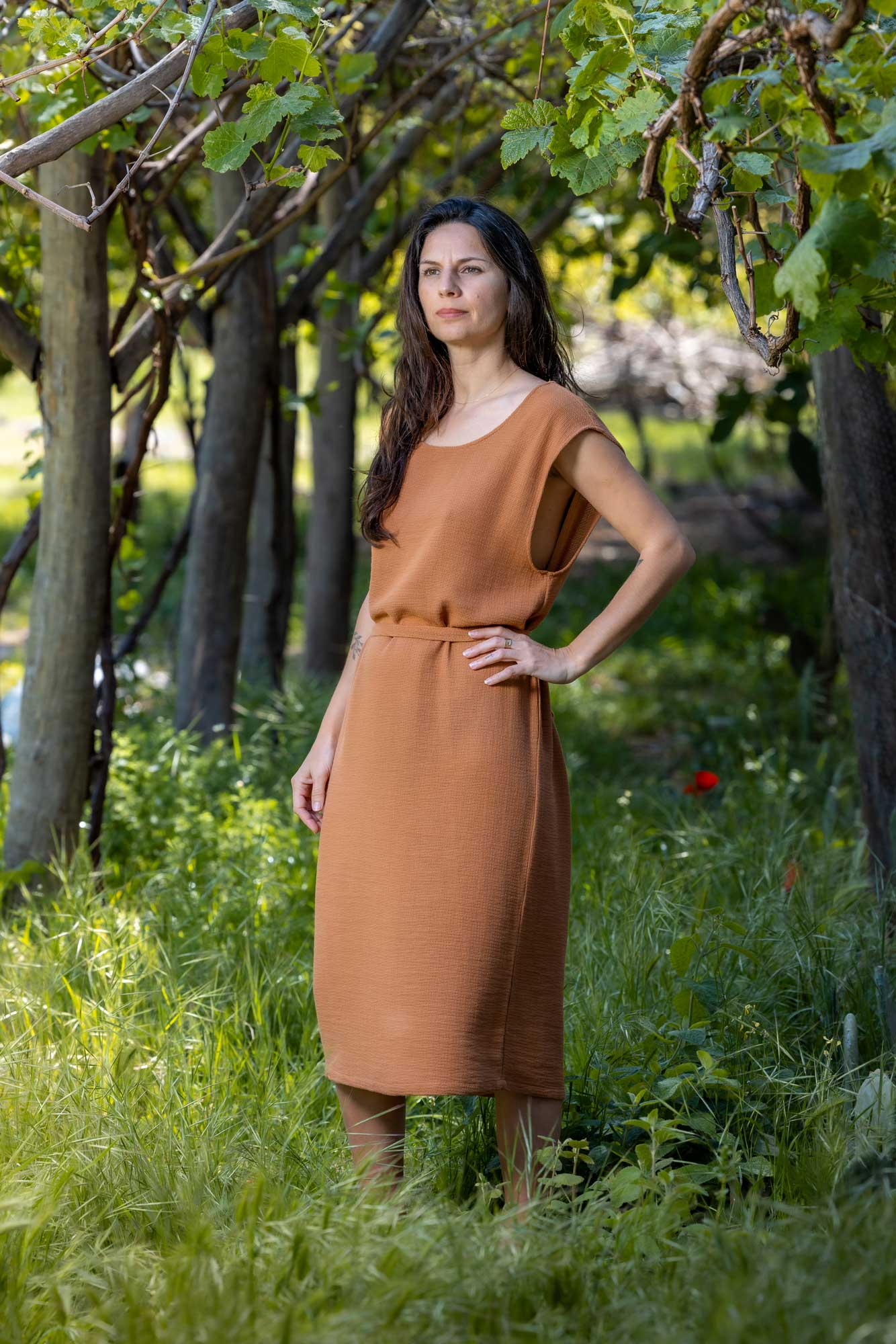 %100 Pamuk dokuma, tarçın rengi, standart beden, uzun, bol kesim, kemerli elbise.